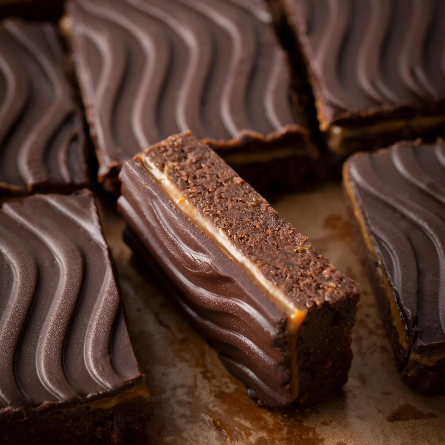 Soft buttery caramel sandwiched between our choco chip brownie and a layer of dark chocolate truffle.